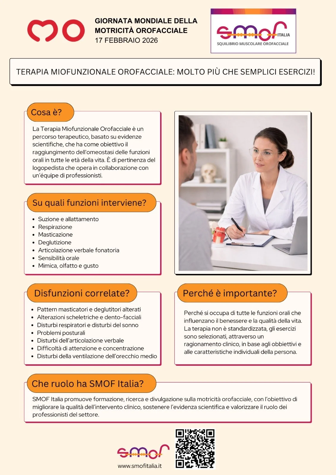 Anche SMOF Italia, l’associazione di riferimento in questo ambito ha condiviso una locandina dedicata a questo tema, che trovi qui sotto e che riassume in modo chiaro il cuore del nostro lavoro, la terapia miofunzionale: